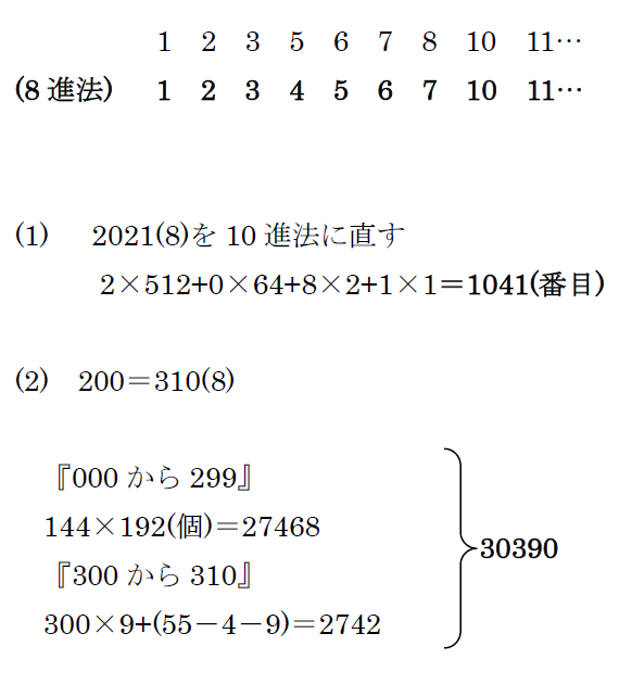 (1)は変則8進法を使ってみました。変則8進法は一般的に塾では5年生で扱う内容です。