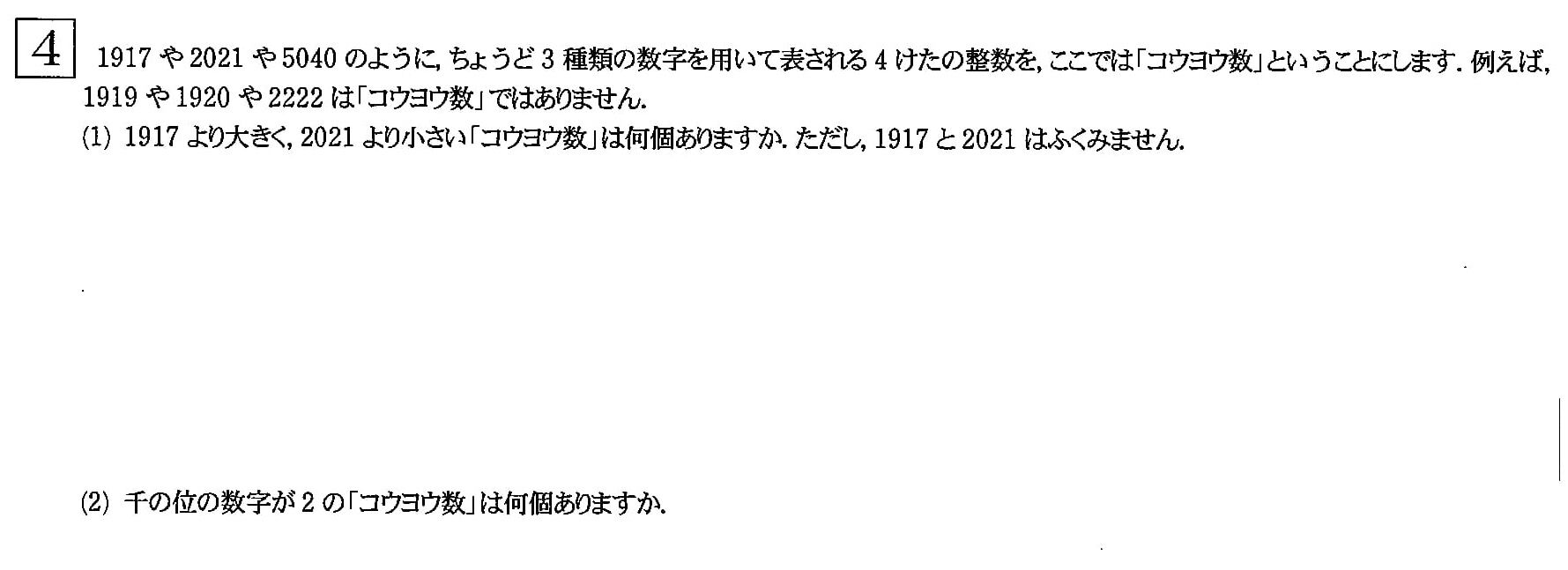 6(2) 2011が0,1,2の3種類の数字からできているように,0から9のうち3種類の数字からできている4けたの整数。